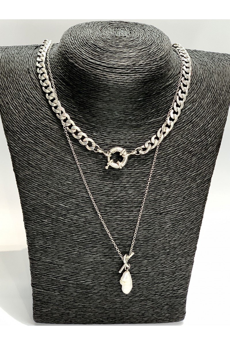 Цепь в серебре на шею двойная с металлической вставкой и имитацией жемчуга.