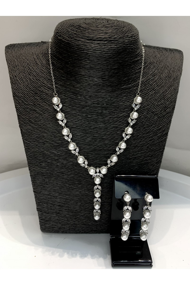 Утонченное колье на шею с серьгами в серебре с цирконами и с имитацией жемчуга.